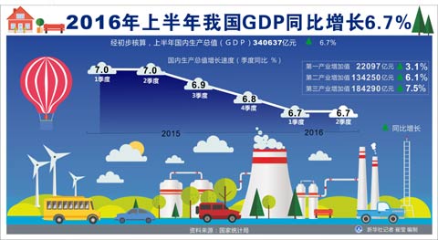 國(guó)家統(tǒng)計(jì)局日前公布的上半年國(guó)民經(jīng)濟(jì)運(yùn)行數(shù)據(jù)顯示,上半年國(guó)內(nèi)生產(chǎn)總值初步核算為340637億元,按可比價(jià)格計(jì)算,同比增長(zhǎng)6.7%。分季度看,一季度同比增長(zhǎng)6.7%,二季度增長(zhǎng)6.7%。專家表示,上半年供給側(cè)結(jié)構(gòu)性改革成效初顯,中國(guó)經(jīng)濟(jì)穩(wěn)中趨好亮點(diǎn)不斷。下半年,經(jīng)濟(jì)運(yùn)行依然面臨內(nèi)外部多方面不確定性,下行壓力仍然較大。政府在財(cái)政政策和貨幣政策上保持穩(wěn)中求進(jìn)的總基調(diào),深入實(shí)施簡(jiǎn)政放權(quán)減稅清費(fèi)和創(chuàng)新驅(qū)動(dòng)發(fā)展戰(zhàn)略等五大宏觀政策,預(yù)計(jì)未來(lái)國(guó)民經(jīng)濟(jì)將保持平穩(wěn)運(yùn)行。
