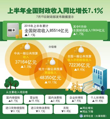 財政部數(shù)據(jù)顯示,1至6月累計,全國一般公共預(yù)算收入85514億元,同比增長7.1%。其中,中央一般公共預(yù)算收入37164億元,同比增長3.3%;地方一般公共預(yù)算本級收入48350億元,同比增長10.1%。全國一般公共預(yù)算收入中的稅收收入72236億元,同比增長8.6%。