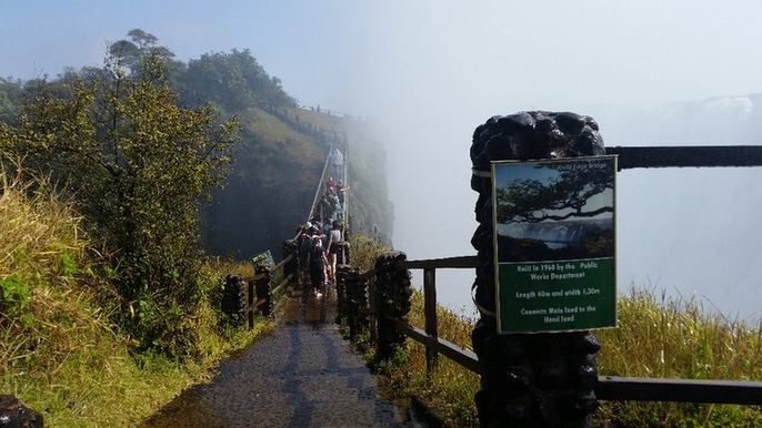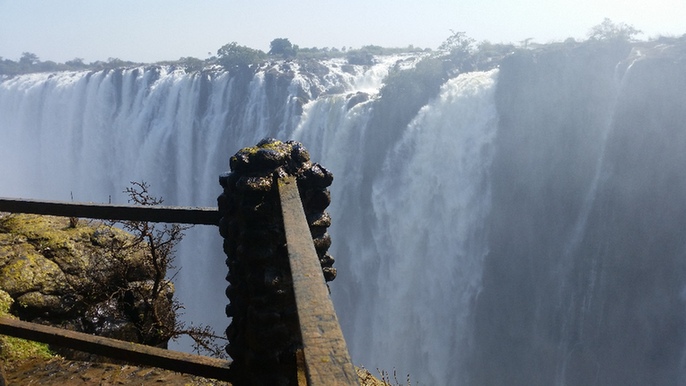 隆隆水聲越來越近,看到了!眼前一個寬不見邊的千丈峽谷,原本潺潺流淌的贊比西河至此飛流直下,頃刻間跌入100多米深的峽谷中,卷起千堆雪,萬重霧。只見千萬條雪浪翻滾,湍流怒涌,仿佛上帝之手將那千萬匹銀練在我們面前同時舞動,令人目不暇接,嘆為觀止。