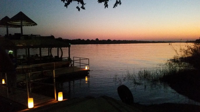 正是黃昏時分,紅心鴨蛋一般的太陽在贊比西河的盡頭慢慢下沉,漫天云蒸霞蔚,夕陽余暉在每個人的臉上鍍上金色,空中不知名的水鳥翻飛,船上熱情歡快的非洲鼓點響起來了,游客們無論何種膚色,都不由地被這音樂這場景感染,情不自禁地隨著樂聲一起舞動起來。