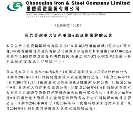 重慶鋼鐵11月1日發(fā)布公告稱,鑒于本次重組所涉及的資產規(guī)模較大,方案論證復雜;且為重大無先例事項,涉及到的具體問題正在向相關監(jiān)管部門進行咨詢,且方案的實施尚需取得多個監(jiān)管部門的批準和認可,公司預計無法于2016年11月2日復牌。公司自2016年11月2日開市起繼續(xù)停牌,繼續(xù)停牌時間不超過六個月。