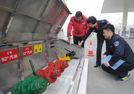 圖為12月18日,河北省邢臺市環(huán)保局執(zhí)法人員在橋西區(qū)一家加油站檢查油氣回收設(shè)施。新華社記者 朱旭東/攝