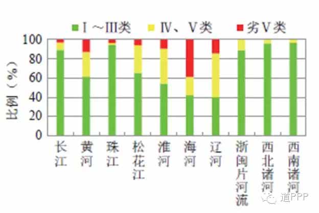 依照環(huán)保部根據(jù)《地表水環(huán)境質(zhì)量標(biāo)準(zhǔn)》(GB3838-2002)所做的統(tǒng)計(jì):2015年,長(zhǎng)江、黃河、珠江、松花江、淮河、海河、遼河等七大流域和浙閩片河流、西北諸河、西南諸河的700個(gè)國(guó)控?cái)嗝嬷?,Ⅰ?lèi)水質(zhì)斷面占2.7%,比2014年下降0.1個(gè)百分點(diǎn);Ⅱ類(lèi)占38.1%,比2014年上升1.2個(gè)百分點(diǎn);Ⅲ類(lèi)占31.3%,比2014年下降0.2個(gè)百分點(diǎn);Ⅳ類(lèi)占14.3%,比2014年下降0.7個(gè)百分點(diǎn);Ⅴ類(lèi)占4.7%,比2014年下降0.1個(gè)百分點(diǎn);劣Ⅴ類(lèi)占8.9%,主要集中在海河、淮河、遼河和黃河流域,比2014年下降0.1個(gè)百分點(diǎn)。各流域水質(zhì)狀況統(tǒng)計(jì)如圖3所示。目前污水處理項(xiàng)目是環(huán)保類(lèi)PPP項(xiàng)目中占比較多的,在未來(lái)可以獲得更詳盡數(shù)據(jù)的基礎(chǔ)上,這些污水處理PPP項(xiàng)目與區(qū)域水污染情況的精確匹配和相應(yīng)截污模式的設(shè)計(jì)也是我們?cè)诤罄m(xù)需要重點(diǎn)研究的。