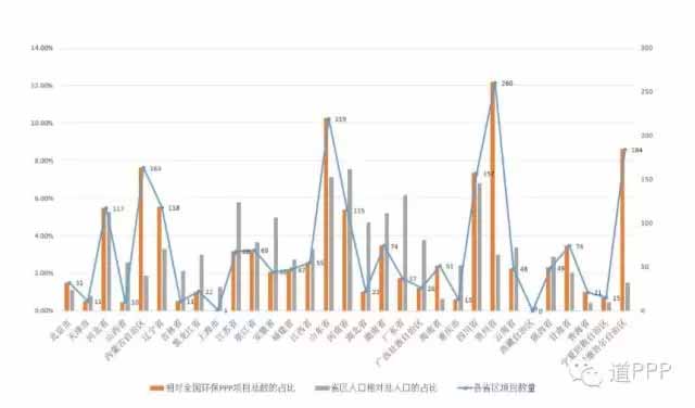 圖10 我國(guó)各省、直轄市、自治區(qū)環(huán)保PPP項(xiàng)目數(shù)量與占比