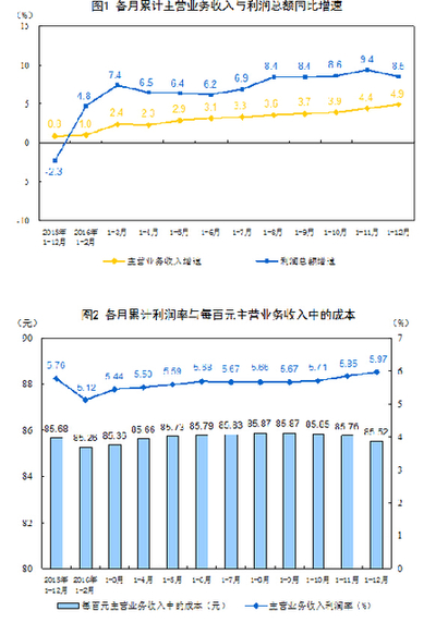 2016年,規(guī)模以上工業(yè)企業(yè)實(shí)現(xiàn)主營(yíng)業(yè)務(wù)收入115.2萬億元,比上年增長(zhǎng)4.9%;發(fā)生主營(yíng)業(yè)務(wù)成本98.5萬億元,增長(zhǎng)4.8%;主營(yíng)業(yè)務(wù)收入利潤(rùn)率為5.97%。