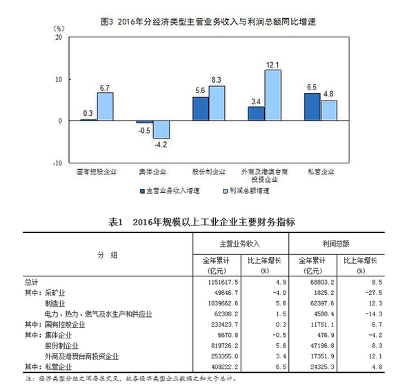 2016年,規(guī)模以上工業(yè)企業(yè)中,國(guó)有控股企業(yè)實(shí)現(xiàn)利潤(rùn)總額11751.1億元,比上年增長(zhǎng)6.7%;集體企業(yè)實(shí)現(xiàn)利潤(rùn)總額476.9億元,下降4.2%;股份制企業(yè)實(shí)現(xiàn)利潤(rùn)總額47196.8億元,增長(zhǎng)8.3%;外商及港澳臺(tái)商投資企業(yè)實(shí)現(xiàn)利潤(rùn)總額17351.9億元,增長(zhǎng)12.1%;私營(yíng)企業(yè)實(shí)現(xiàn)利潤(rùn)總額24325.3億元,增長(zhǎng)4.8%。