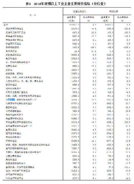 2016年,在41個(gè)工業(yè)大類行業(yè)中,29個(gè)行業(yè)利潤(rùn)總額比上年增加,1個(gè)持平,11個(gè)減少。主要行業(yè)利潤(rùn)情況如下:煤炭開采和洗選業(yè)利潤(rùn)總額比上年增長(zhǎng)2.2倍,農(nóng)副食品加工業(yè)增長(zhǎng)5.5%,紡織業(yè)增長(zhǎng)3.5%,石油加工、煉焦和核燃料加工業(yè)增長(zhǎng)1.6倍,化學(xué)原料和化學(xué)制品制造業(yè)增長(zhǎng)10.7%,非金屬礦物制品業(yè)增長(zhǎng)11.2%,黑色金屬冶煉和壓延加工業(yè)增長(zhǎng)2.3倍,有色金屬冶煉和壓延加工業(yè)增長(zhǎng)42.9%,通用設(shè)備制造業(yè)增長(zhǎng)0.2%,專用設(shè)備制造業(yè)增長(zhǎng)2.1%,汽車制造業(yè)增長(zhǎng)10.8%,電氣機(jī)械和器材制造業(yè)增長(zhǎng)12.6%,計(jì)算機(jī)、通信和其他電子設(shè)備制造業(yè)增長(zhǎng)12.8%,電力、熱力生產(chǎn)和供應(yīng)業(yè)下降17.5%,石油和天然氣開采業(yè)由同期盈利轉(zhuǎn)為虧損。