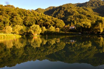 官鵝溝水秀。這里十余個(gè)大小不等、形態(tài)各異的湖泊,猶如一串綠色的珍珠鑲嵌在溝內(nèi),湖水清澈透底,隨湖底地貌高低呈不同顏色,那些倒映在湖中的古樹像一條條巨龍臥在湖底。藍(lán)天白云和青山古樹,映入湖中,使天地渾然一體,沒有界限。