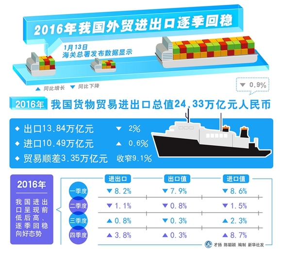 一是全年進(jìn)出口降幅小于2015年。2016年全國進(jìn)出口24.3萬億元(折3.69萬億美元),下降0.9%,降幅比2015年收窄6.1個(gè)百分點(diǎn)。