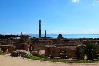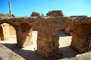 迦太基古城羅馬時(shí)代的遺跡殘存較多。羅馬人在比爾薩山上建有大神廟,露天柱廊上則保存有羅馬在迦太基最杰出的勝利神和豐收神的雕像。著名的公共浴場(chǎng)則是在公元145年-162年間羅馬皇帝安東尼時(shí)期建成的,是古羅馬的第四大浴場(chǎng)。從基部殘存的柱石、斷墻、拱門(mén)可隱約看出兩邊對(duì)稱(chēng)排列的一間間浴室,浴室有更衣室、冷水室、溫水室、蒸汽浴室、按摩室、健身房等。浴場(chǎng)用水則從遠(yuǎn)處的山泉通過(guò)60公里長(zhǎng)的引水渡槽引來(lái)。渡槽高6米-20米,至今仍遺存數(shù)段渡槽和支架。