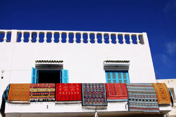 突尼斯海灣的邊上靜靜的藍(lán)白小鎮(zhèn),在透明的陽(yáng)光中呼吸出了浪漫的色調(diào),這里被譽(yù)為“小圣托里尼”。之所以稱(chēng)它為“藍(lán)白小鎮(zhèn)”,是因?yàn)檫@個(gè)坐落在地中海邊峭壁上的鎮(zhèn)子,所有的房屋只有兩種顏色,白色的墻,藍(lán)色的門(mén)窗。如此單純,卻是如此美麗。整個(gè)小鎮(zhèn)是沿山勢(shì)蜿蜒而上的,布局很簡(jiǎn)單,一條鵝卵石鋪就的街道,兩邊是在陽(yáng)光下閃閃發(fā)亮的白色房屋,也有些小巷從屋子內(nèi)伸出去。房屋都只有二三層高,最讓人感覺(jué)仿佛置身于童話(huà)的,是那白色墻上鑲嵌著的藍(lán)色的鐵窗和藍(lán)色的木門(mén)。阿拉伯式的蔓藤渦卷展現(xiàn)在鐵窗窗欞,對(duì)稱(chēng)而迷幻;木門(mén)上半部的穹頂代表著清真寺的建筑,門(mén)上的藍(lán)色銅釘則拼合出星星和月亮,還有弓箭、花卉等伊斯蘭圖案,華麗而精美。