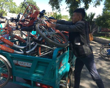 沒過多久,一輛載滿共享單車、用于調(diào)度的電動三輪車駛來。車剛停穩(wěn),就被伸長手臂競相掃描二維碼開鎖的人們團團圍住。胡貴林緊忙上前一塊卸車。此后約40分鐘時間里,幾輛調(diào)度車周而復(fù)始跑了十多趟,每次都是滿載而來、空車離去。