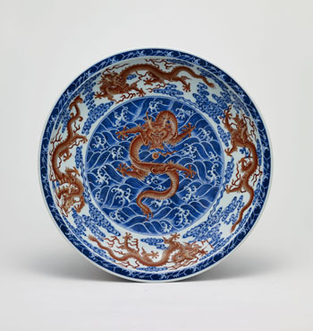 具體來看,清雍正青花礬紅“水波云龍”紋折沿大盤,款識為“大清雍正年制”六字雙行楷書款,該品形制恢宏,釉汁瑩潤如玉。盤心繪海水立龍捧珠圖,氣勢凌人,躍然眼前。內(nèi)外壁分繪三條行龍和一條翼龍,或回首、或前行,龍爪有三爪、五爪之別,龍尾有花尾、尖尾之分。以礬紅裝飾龍紋,色澤鮮妍厚潤,色階過渡自然,騰龍矯健有神,氣勢非凡。祥云迤邐,浪濤卷卷,更見映襯九龍之動感無比鮮明。海水云龍,二者連接處過渡自然,融為一體,使人不得不贊嘆畫師技藝之精湛,彰顯雍正時(shí)期宮廷藝術(shù)的無比嚴(yán)謹(jǐn)和精致。