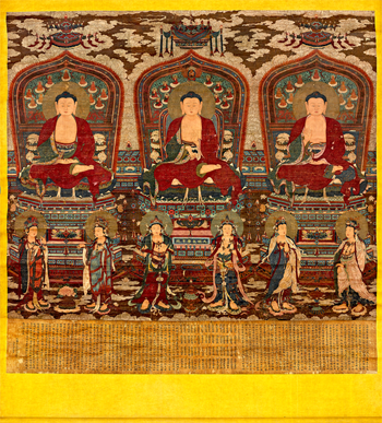 永樂御制《三世佛六菩薩寶相》,裝飾繁縟,衣紋飄逸流暢,色彩富麗沉穩(wěn),帶有唐宋以來中原地區(qū)佛教繪畫的鮮明遺風(fēng),同時又吸收和融入了元代佛像造型及流行于內(nèi)地的藏傳佛教藝術(shù)元素,但整體風(fēng)格又不同于元代佛畫,具有明初佛畫的鮮明特點,展現(xiàn)出端莊典雅、富麗堂皇、恢宏大氣的皇家藝術(shù)氣象,比定為國家館藏一級品最負(fù)盛名的敕賜山西右玉寶寧寺佛畫還要早五十多年,風(fēng)格一脈相承,且繪畫技法有過之而無不及,是罕見的宮廷佛教文物瑰寶。