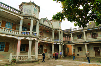 走在東大村的斑駁古樸小道上,古厝房頂上成片的紅瓦在藍(lán)天映襯下,耀眼而獨(dú)特。誰能想到,這么偏僻的小山村里竟藏有數(shù)量如此之多,規(guī)模如此之大的老洋房呢?令人驚嘆!在龍眼密林掩映中,一座雙層的堞樓“把守”在前往洋房大厝集中區(qū)的路口。堞樓在古代俗稱炮樓,因舊時匪患時起,早年下南洋的東源村村民姚文瑞,回國后募捐建造了這座堞樓用于自衛(wèi)。正是因為這座不起眼的鋼混結(jié)構(gòu)堞樓,全村華僑的房產(chǎn)才能夠半世紀(jì)安然無恙。在堞樓的一層保存著完好的射擊孔,沿著狹小的樓梯上到二樓,四個角落設(shè)計有鋼混結(jié)構(gòu)的木窗,還有數(shù)個正方形槍眼,如果置身樓頂極目遠(yuǎn)眺,時光頓時倒回到當(dāng)年東大、東源村人與匪患抗?fàn)幍姆榛饸q月。
