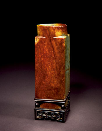 另外,還有一件玉琮也值得關(guān)注。根據(jù)用料及工藝判斷,這件玉琮應(yīng)為距今四千多年前的齊家文化風(fēng)格。周身不琢紋飾,一側(cè)留有漿皮。經(jīng)過(guò)歷代收藏家盤(pán)玩,皮殼早已“熟透”,留皮處呈誘人的棗紅皮色。眾所周知,清宮有改制前朝舊物的習(xí)俗,這件玉琮應(yīng)該是在清代之前即已出土,后來(lái)入藏清宮,在玉琮內(nèi)部配制銅膽,并專門(mén)配有紅木底座,被改成花插使用。這種老器新用的做法,在今天故宮博物院館藏器物中經(jīng)常能見(jiàn)到。