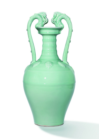 據(jù)介紹,此次重要拍品雍正粉青釉貼花雙龍盤口尊自五代后消失,至清雍正官窯復(fù)現(xiàn),雍正之后除乾隆早期尚有少量燒制外,之后又銷聲匿跡。雍正帝非常重視御制瓷器,常委托御窯廠制作仿古式樣,此雍正粉青釉貼花雙龍盤口尊仿唐朝傳瓶式樣,青翠瑩潤的釉汁則仿照宋龍泉青瓷。雍正時景德鎮(zhèn)窯廠燒制的雍正粉青釉貼花雙龍盤口尊分兩種尺寸,第一種較小,約32厘米左右;第二種較大,約52厘米左右,拍品屬較大的一類,而要燒制如此龐大且器形復(fù)雜的瓶子難度極高,所以同類傳世品少見。目前傳世的雍正粉青釉貼花雙龍盤口尊只有四件,本拍品是其中之一,亦是屬私人收藏里唯一品相完美的一件,另外三件分別藏沈陽故宮博物院、美國克利夫蘭藝術(shù)博物館及加州陳氏典藏博物館。此尊源自曾為美國加州名流、女商人及慈善家Maruja Baldwin收藏,她的第二任丈夫Baldwin M.Baldwin是加州地產(chǎn)大亨E.J.(Lucky) Baldwin的孫兒,其家族是最早在加州發(fā)展的地產(chǎn)商及財團之一,南加州多個地標(biāo)均是以此家族定名。此外,這件雍正粉青釉貼花雙龍盤口尊,曾于2004年在佳士得拍賣上亮相,并以17,423,750港元的成交價創(chuàng)下當(dāng)時的清代單色釉瓷器世界紀(jì)錄。