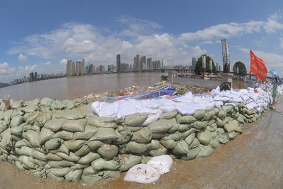 7月3日零時(shí)12分,湘江長(zhǎng)沙站水位上升到39.51米,創(chuàng)下有記錄以來歷史新高。這是長(zhǎng)沙城區(qū)湘江沿岸用沙袋修筑的子堤(7月3日攝)。記者 龍弘濤 攝? |