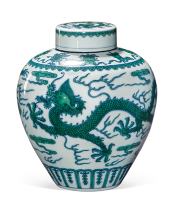 以龍紋為主要紋飾的藝術(shù)作品很早便出現(xiàn),直到明清時期達到巔峰。瓷器、玉器、金銀器、漆器等等,往往被自命為“真龍?zhí)熳印钡牡弁跛姁?。不同時期的龍紋具有不同的藝術(shù)風格,而“龍紋”的風格往往與當時的時代氣息相當吻合。以明代為例,永宣時期為明朝國力最昌盛的時期,社會生產(chǎn)力得到極大發(fā)展,體現(xiàn)在龍的形態(tài)與表情上就形成威猛神氣的姿態(tài)。而發(fā)展到明中期成化弘治年間,社會穩(wěn)定而發(fā)展乏力,人們更愿意享受富貴生活而不是不斷開疆拓土,同時期龍紋就顯得規(guī)矩有余而霸氣不足。再到明晚期的嘉萬年間,各種社會問題逐漸顯現(xiàn),皇帝甚至出現(xiàn)不理朝政的現(xiàn)象,龍紋畫片也就變得如皮影畫一樣民俗風味十足。由此可見,社會氣質(zhì)的變遷會影響藝術(shù)家與工匠們的審美意識形態(tài),從而直接體現(xiàn)在藝術(shù)風格的轉(zhuǎn)變上,同樣的道理如輪回般再次出現(xiàn)在清代的藝術(shù)品領(lǐng)域,比如龍紋風格的轉(zhuǎn)變上。從順治康熙時期龍紋的霸氣甚至狂放,到雍正乾隆時期的氣派而富有張力,到嘉慶道光時期的安詳而富貴,最后到晚清時期的作意甚至呆板。今年嘉德春拍宮廷拍賣中幾件明清時期的龍紋瓷器玉器是中國在最富足時期的藝術(shù)巔峰之作,通過它們可以窺見皇家藝術(shù)的精美與震撼。這個門類亦是當下收藏界的熱門板塊。本版精選了今年春拍的幾件作品供讀者賞析。