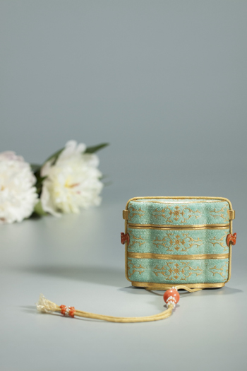 當(dāng)一件實(shí)用器,被賦予了越來(lái)越多的精神內(nèi)涵,便超越了“用”與“器”,成就了從實(shí)用器到陳設(shè)器的轉(zhuǎn)變。乾隆皇帝會(huì)把火鐮荷包,連同其他心愛(ài)的小文玩,一起放在多寶格或小柜中賞玩陳設(shè)。臺(tái)北故宮博物院藏品中可見(jiàn),紫檀雕云龍紋小柜中,有黃緞彩繡福壽紋火鐮荷包一件;紫檀嵌彩瓷博古圖小柜中,有銀鍍金嵌松石珊瑚火鐮荷包一件……
