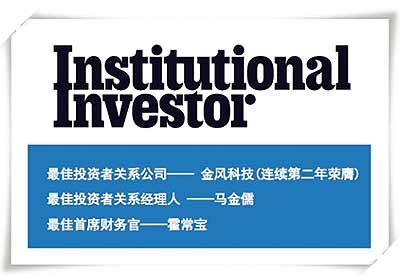 國際資本市場權(quán)威金融雜志《機構(gòu)投資者》(Institutional Investor)年度評獎結(jié)果日益揭曉,金風科技從2,500余家亞洲上市公司中脫穎而出,包攬“最佳投資者關(guān)系公司”、“最佳投資者關(guān)系經(jīng)理人”和“最佳首席財務(wù)官”三項大獎。
