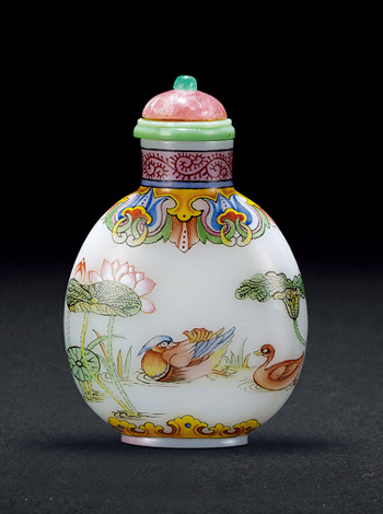 清 涅白胎畫(huà)琺瑯蓮池鴛鴦紋鼻煙壺 |