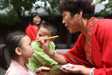 | 8月22日,一位老師在一名孩子的頭部點朱砂。 當日,河北省滄州市運河區(qū)文廟社區(qū)為轄區(qū)孩子舉行“開筆禮”,26名即將升入小學的孩子在老師和家長帶領下,通過朱砂開智、擊鼓鳴志、開筆學字等環(huán)節(jié)感受中國傳統(tǒng)文化。新華社發(fā)(傅新春 攝)? |