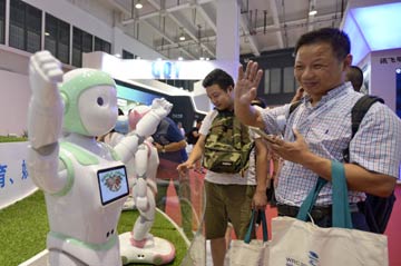 8月22日,觀眾在參觀一廠家的教育型智能機器人。2017世界機器人大會于8月23日至27日在北京亦創(chuàng)國際會展中心舉行。記者 李欣 攝? |