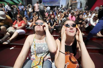 ?當?shù)貢r間8月21日,一次罕見的日全食景觀橫貫美國大陸,這是1918年以來首次發(fā)生僅在美國可見且美國東西兩岸皆可觀測的日全食。除此之外,在全食帶兩側數(shù)千千米的區(qū)域內(nèi)都能觀測到食分不等的日偏食。圖為人們在美國紐約時報廣場觀看日食。記者 王迎 攝 |