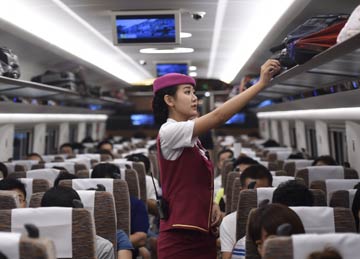 8月21日,一名工作人員在北京南至天津的“復興號”上幫顧客整理行李。自8月21日起,鐵路部門擴大“復興號”動車組列車開行范圍,京津城際列車開行19.5對“復興號”動車組列車。記者 羅曉光 攝? |