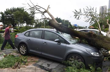 ?8月23日,珠海情侶路旁的一棵大樹被吹倒砸在汽車上。當日12時50分左右,今年第13號臺風“天鴿”(強臺風級)在廣東珠海南部沿海登陸,登陸時中心附近最大風力有14級(45米/秒)。記者 盧漢欣 攝 |