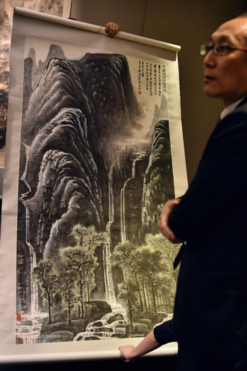 ??? 圖為蘇富比工作人員在介紹即將拍賣的李可染的作品《千巖競秀 萬壑爭流》。新華社發(fā)?。ㄍ醐t 攝) |