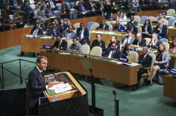 ??? 9月19日,在紐約聯(lián)合國(guó)總部,法國(guó)總統(tǒng)馬克龍?jiān)诼?lián)大一般性辯論上發(fā)言。第72屆聯(lián)合國(guó)大會(huì)一般性辯論19日在紐約聯(lián)合國(guó)總部開(kāi)始舉行。記者 王迎 攝 |