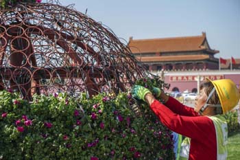 ??? 9月18日,工作人員在天安門(mén)廣場(chǎng)布置花卉。當(dāng)日,天安門(mén)廣場(chǎng)國(guó)慶花卉布置工作開(kāi)始。據(jù)介紹,國(guó)慶期間天安門(mén)廣場(chǎng)中心將布置“祝福祖國(guó)”巨型花籃,東西長(zhǎng)安街將各擺放7組花壇。記者 殷剛 攝 |