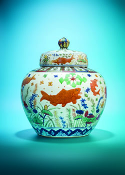 ??? 明嘉靖 五彩魚藻紋蓋罐 六字楷書款 |