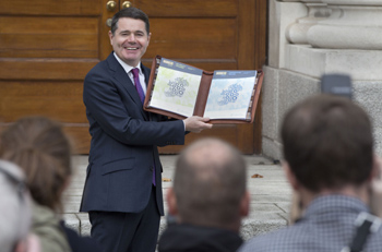 ??? 10月10日,在愛爾蘭首都都柏林,財(cái)政部長帕斯卡爾·多諾霍展示2018財(cái)年預(yù)算案。愛爾蘭政府10日向議會(huì)提交2018財(cái)年預(yù)算案。多諾霍表示,新財(cái)年將大幅增加衛(wèi)生、教育、住房、公共交通、社會(huì)福利等領(lǐng)域的預(yù)算開支。新華社/法新 |