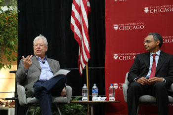 ??? 10月9日,在美國芝加哥大學(xué)布斯商學(xué)院,理查德·塞勒教授(左)出席記者會(huì)。瑞典皇家科學(xué)院9日宣布,將2017年諾貝爾學(xué)獎(jiǎng)授予美國經(jīng)濟(jì)學(xué)家理查德·塞勒,以表彰他在行為經(jīng)濟(jì)學(xué)研究領(lǐng)域作出的突出貢獻(xiàn)。記者 王強(qiáng) 攝 |