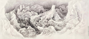 此次這件《山原的凝視》,正是受讓·奧古斯特·多米尼克·安格爾的名作《露易斯·奧松維爾夫人》的啟發(fā),畫中夫人的眼神引起了劉丹的注意與無限的遐想,她瞳孔中的深邃透閃著神秘的光芒,充滿了無法捉摸的可能,正是在這迷人的眼神之中,劉丹的心中閃現(xiàn)出了一脈奇幻的山原。藝術(shù)家將古今中西的經(jīng)緯彌合在了一仁瞳孔之中,他讓我們在奧松維爾夫人的凝視中看見了另一個維度中的山原川澤。