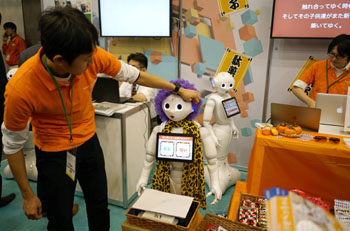 ??? 11月21日,在日本東京舉行的2017軟銀機器人世界大會上,一名工作人員為人型機器人Pepper戴上假發(fā)。當日,為期兩天的2017軟銀機器人世界大會在東京開幕。新華社/歐新 |