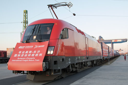 11月27日,布達(dá)佩斯至長沙國際貨運(yùn)回程班列首發(fā)儀式在匈牙利首都布達(dá)佩斯舉行,這標(biāo)志著布達(dá)佩斯至長沙的中歐班列回程線路正式開通。 新華社發(fā)(弗爾季·奧蒂洛 攝)