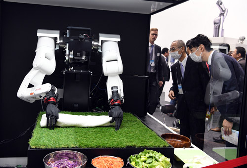 2017國際機(jī)器人展覽11月29日在日本東京開幕。圖為機(jī)器人表演疊毛巾。記者 馬平 攝