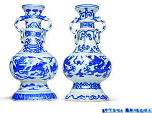 | 明嘉靖 青花龍鳳紋活環(huán)雙耳瓶一對(duì)? |