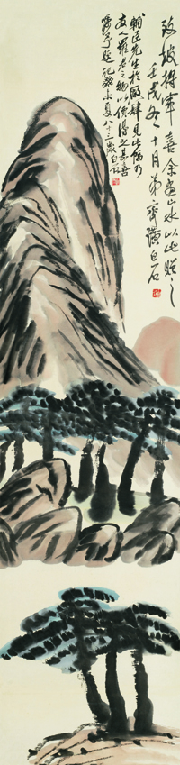 “澄道——近現(xiàn)代繪畫夜場”則甄選近現(xiàn)代名家杰作52件。吳昌碩1914年創(chuàng)作的《壽石天竺》,是以書法入畫的代表之作;陸儼少繪于1979的《竹桐清暑》可謂是集大成之作;黃賓虹創(chuàng)作于1947年《黃山連理松》可謂“丹青隱墨,墨隱丹青”,水墨與青綠相融合,營造出了黃山氤氳朦朧的氛圍;張大千的《松陽滴翠》自題“擬巨然筆意”;《晚波魚艇》尺幅達(dá)到41.3平尺,并為李秋君上款;傅抱石的《雪夜訪友圖》創(chuàng)作時(shí),當(dāng)時(shí)重慶物資匱乏,此九尺巨制極為罕見,畫面左側(cè)中部鈐有“抱石得心之作”印章,為傅抱石金剛坡時(shí)期的巔峰之作;陳少梅繪于1945年的《西園雅集圖》,是其成熟期的人物畫代表巨作和明世之作。