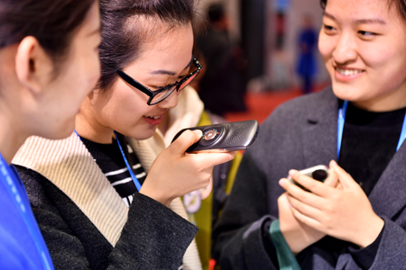 12月2日,在世界互聯(lián)網(wǎng)大會(huì)·互聯(lián)網(wǎng)之光博覽會(huì)上,參觀者在科大訊飛展臺(tái)體驗(yàn)訊飛“曉譯”翻譯機(jī)。記者 李鑫 攝
