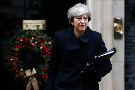 ??? 12月11日,在英國倫敦,英國首相特雷莎·梅走出唐寧街10號首相府。特雷莎·梅11日說,英國預計向歐盟支付350億至390億英鎊(約合470億至520億美元)的“脫歐分手費”,但條件是雙方未來要達成一份貿(mào)易協(xié)議。新華社/法新