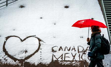 ??? 12月11日,在德國漢堡,一名女子撐傘走在雪后的路上。新華社/歐新