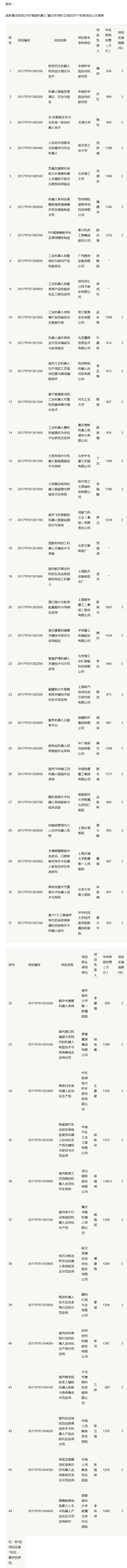 科技部高技術(shù)研究發(fā)展中心12月28日公示了國家重點研發(fā)計劃“智能機(jī)器人”重點專項2017年度項目名單,本次共公示31個項目,國撥經(jīng)費(fèi)2.9635億元,項目牽頭單位44家,其中,27個項目的實施周期為3年,4個項目在實施1年后,需評估擇優(yōu)。具體名單如下: