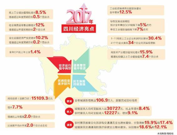 1月19日,省統(tǒng)計(jì)局在成都召開2017年全省經(jīng)濟(jì)形勢(shì)新聞發(fā)布會(huì),公布2017年四川經(jīng)濟(jì)運(yùn)行“成績(jī)單”:2017年全省經(jīng)濟(jì)總量超過3.6萬億元,GDP同比增長(zhǎng)8.1%,增速比全國(guó)平均水平高出1.2個(gè)百分點(diǎn)。