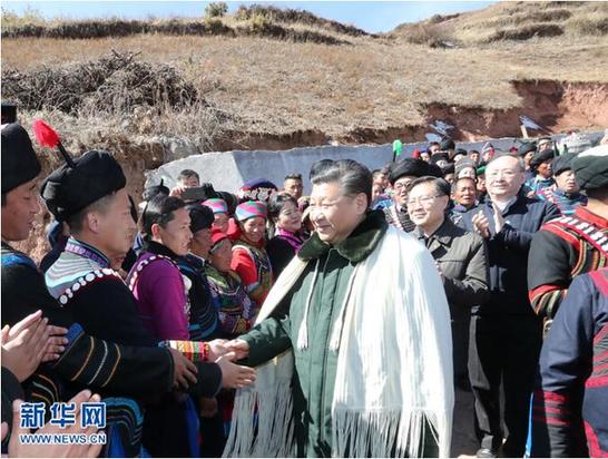 三河村平均海拔2500多米,是一個彝族貧困村。習(xí)近平沿著石板小路步行進(jìn)村,察看村容村貌和周邊自然環(huán)境。他先后走進(jìn)村民吉好也求、節(jié)列俄阿木2戶貧困家庭看望,詳細(xì)觀看門前的扶貧聯(lián)系卡,同主人親切拉家常,詢問生活過得怎么樣,發(fā)展什么產(chǎn)業(yè),收入有多少,孩子有沒有學(xué)上。他饒有興趣地聽10歲小女孩吉好有果唱《國旗國旗真美麗》,并帶頭鼓掌。在村民節(jié)列俄阿木家,習(xí)近平同村民代表、駐村扶貧工作隊員圍坐在火塘邊,一起分析當(dāng)?shù)刎毨Оl(fā)生的原因,謀劃精準(zhǔn)脫貧之策。大家用樸實生動的語言表達(dá)了見到總書記的喜悅和幸福,暢敘了黨和政府對彝族同胞的關(guān)懷關(guān)愛,述說了脫貧攻堅行動給鄉(xiāng)親們帶來的大量實惠,人人都邊說邊激動得流淚。習(xí)近平飽含深情地說,我一直牽掛著彝族群眾,很高興來到這里,看到大家日子一天天好起來,心里十分欣慰。得知近年來村里大力發(fā)展種養(yǎng)業(yè),引進(jìn)優(yōu)良品種的牛豬羊,家家戶戶種植了馬鈴薯、核桃、花椒,農(nóng)民收入持續(xù)增加,習(xí)近平十分高興。他強(qiáng)調(diào),發(fā)展特色產(chǎn)業(yè)、長期穩(wěn)定致富,都需要人才。要培養(yǎng)本地人才,引導(dǎo)廣大村民學(xué)文化、學(xué)技能,提高本領(lǐng),還要移風(fēng)易俗,通過辛勤勞動脫貧致富。習(xí)近平指出,我們搞社會主義,就是要讓各族人民都過上幸福美好的生活。全面建成小康社會最艱巨最繁重的任務(wù)在貧困地區(qū),特別是在深度貧困地區(qū),無論這塊硬骨頭有多硬都必須啃下,無論這場攻堅戰(zhàn)有多難打都必須打贏,全面小康路上不能忘記每一個民族、每一個家庭。