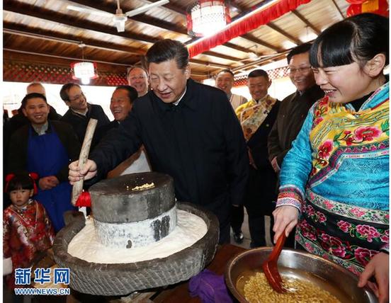 這是2月12日上午,習(xí)近平在阿壩藏族羌族自治州汶川縣映秀鎮(zhèn)考察時同居民群眾一起磨豆花。 新華社記者 鞠鵬 攝